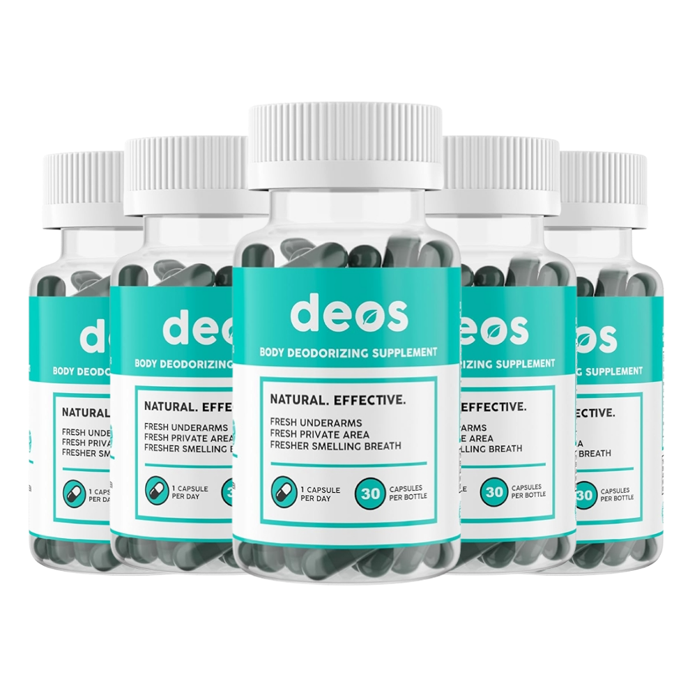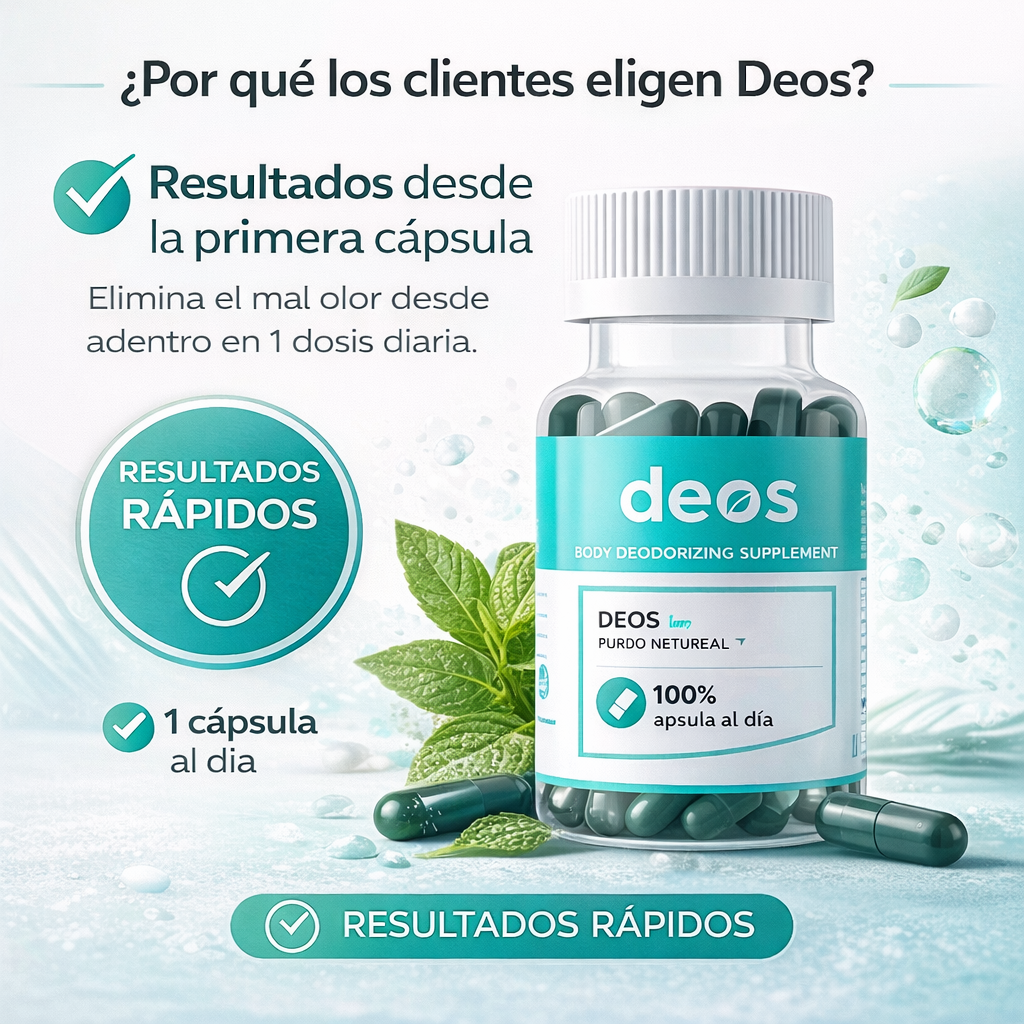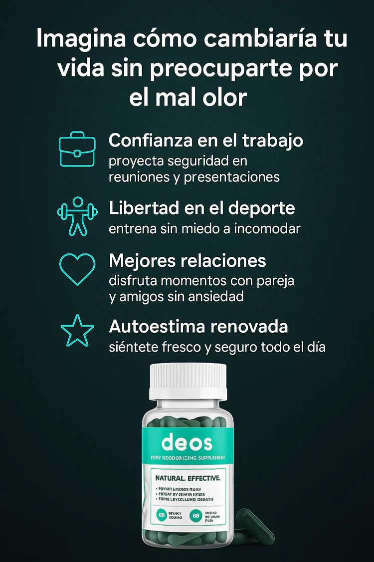 DEOS es un suplemento desodorizante corporal en cápsulas que ayuda a neutralizar el mal olor desde el interior. No tapa el olor con perfume, sino que apoya a tu cuerpo para que el sudor, el aliento y la zona íntima huelan más neutro.