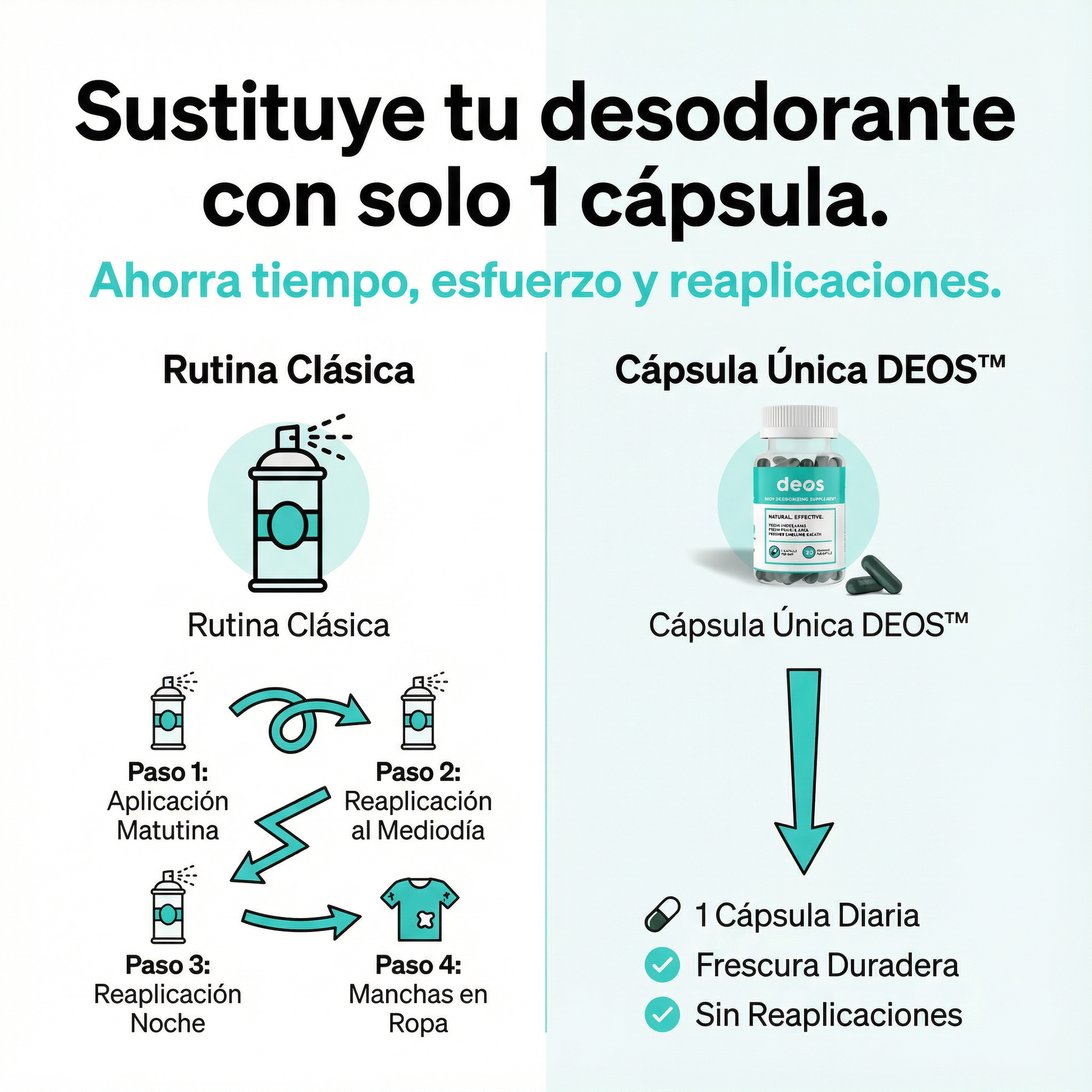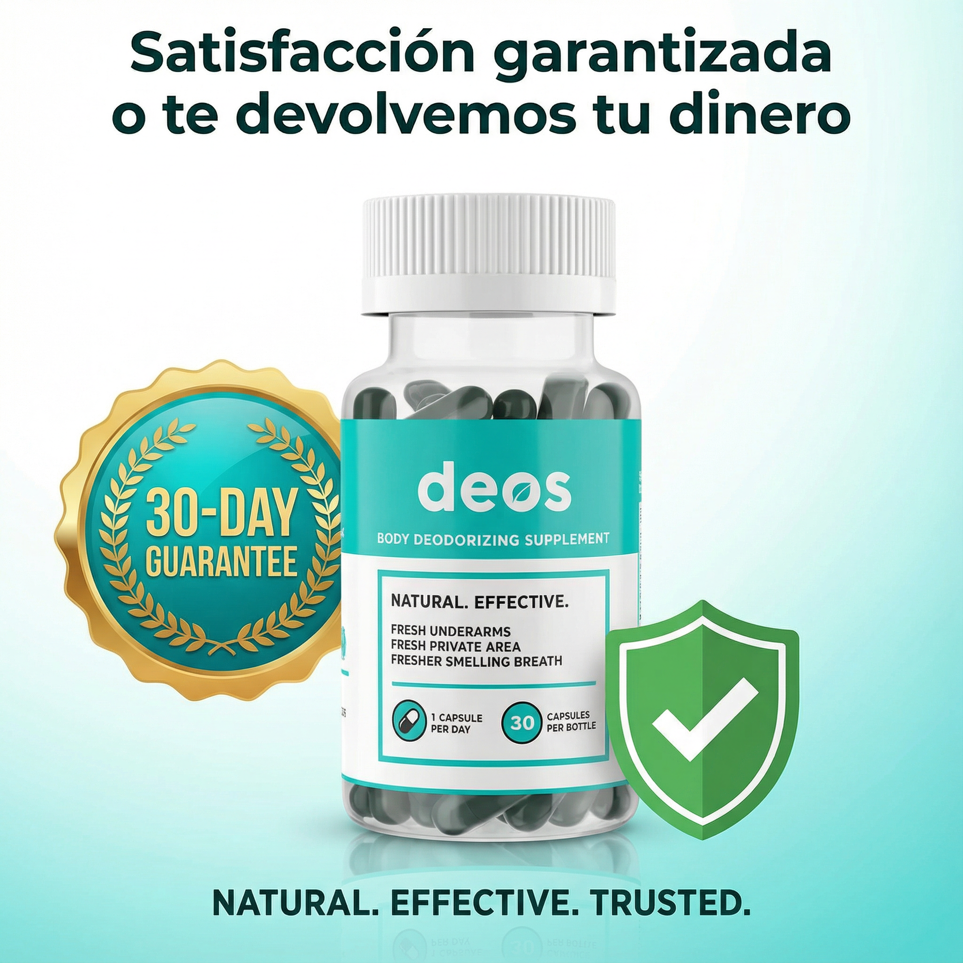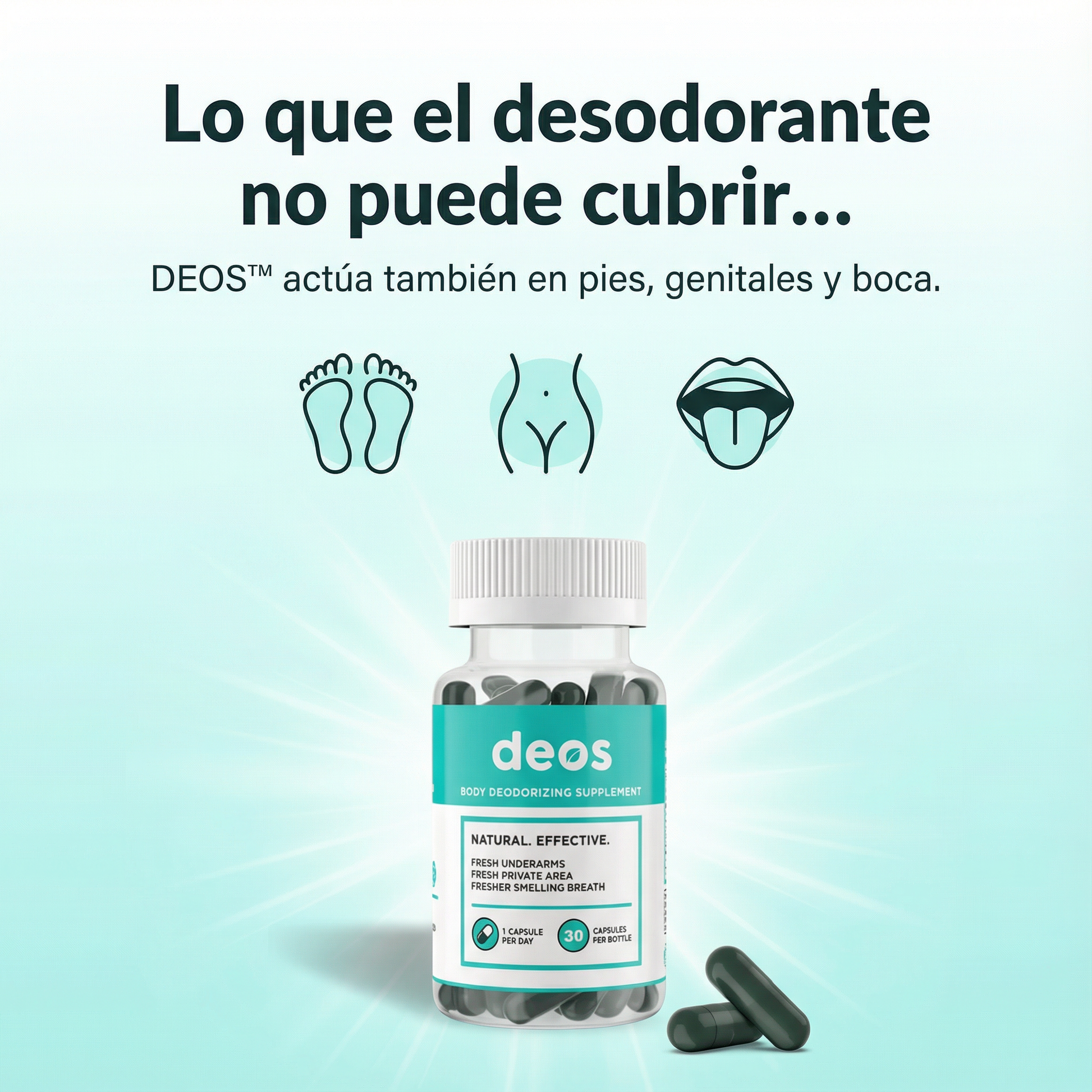 DEOS es un suplemento desodorizante corporal en cápsulas que ayuda a neutralizar el mal olor desde el interior. No tapa el olor con perfume, sino que apoya a tu cuerpo para que el sudor, el aliento y la zona íntima huelan más neutro.
